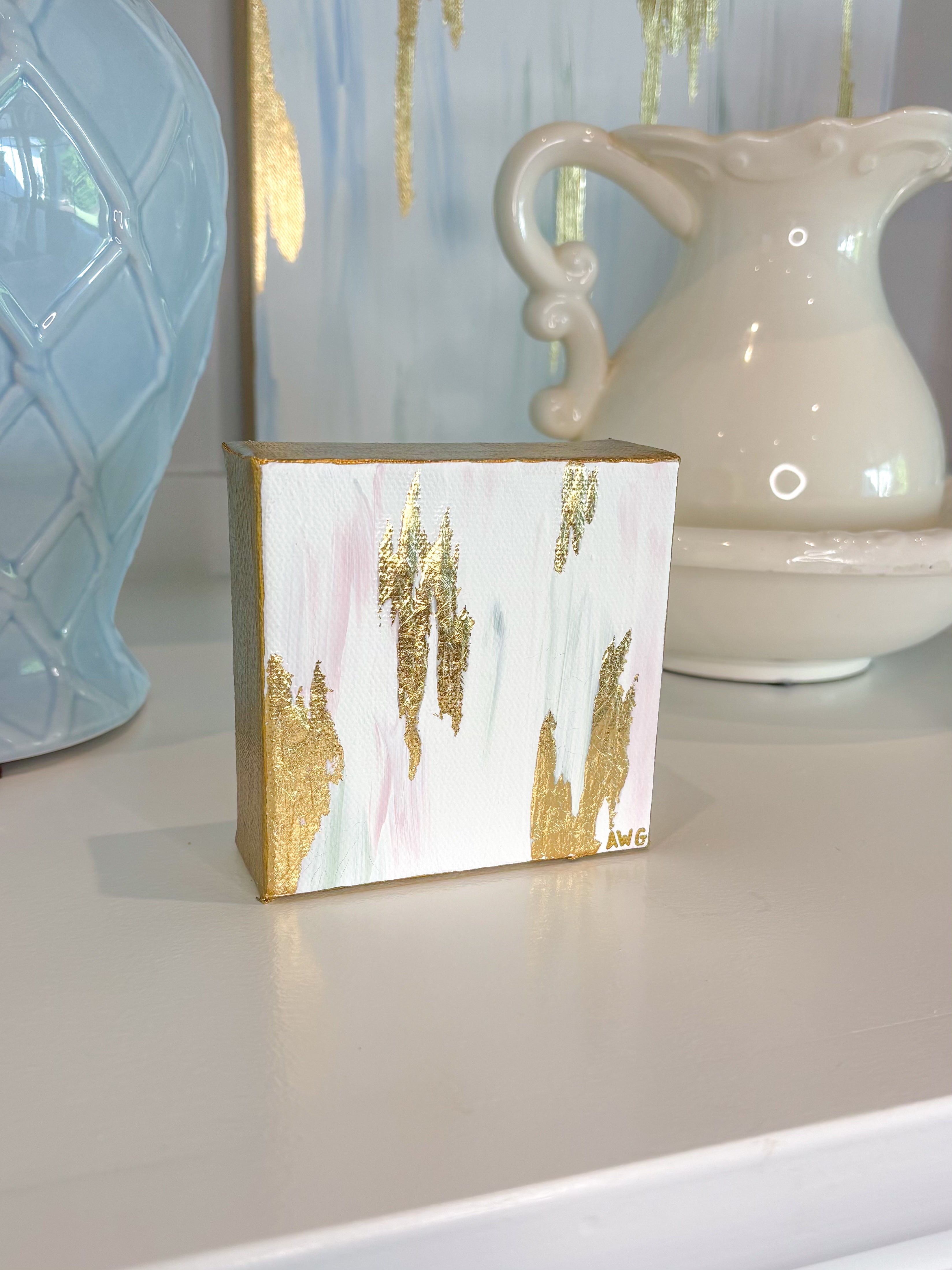 An acknowledgement of beauty in simplicity, Blushing Perfection is a miniature abstract with soft petal pinks and gold leaf. Ideal for a curated shelf, styled coffee table or for gifting.