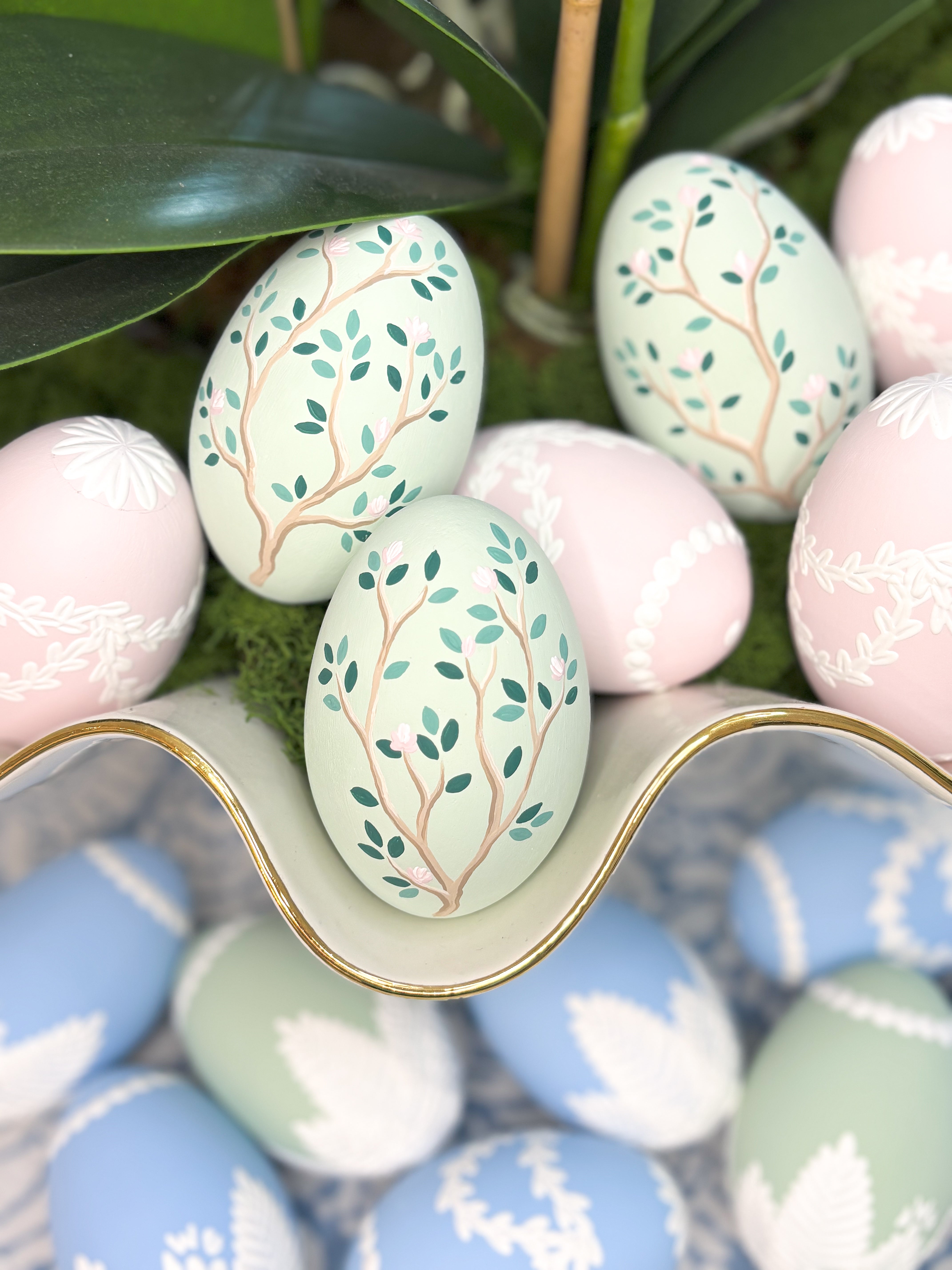 Our delicately hand painted chinoiserie Easter Eggs are individual works art. Each egg takes over a week to complete and is wrapped in a beautiful, one of a kind chinoiserie pattern. No two eggs are identical! These make lovely accents for Easter baskets, Easter decor, shelving displays and tablescapes.